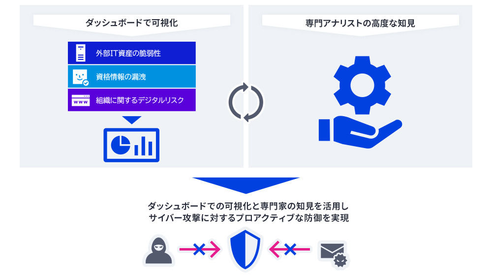 NECセキュリティが提供する「外部IT資産リスク可視化サービス」では、これらの3つの要素を可視化し、専門アナリストの知見を加えることで、サイバー攻撃に対するプロアクティブな防御を包括的に支援します。